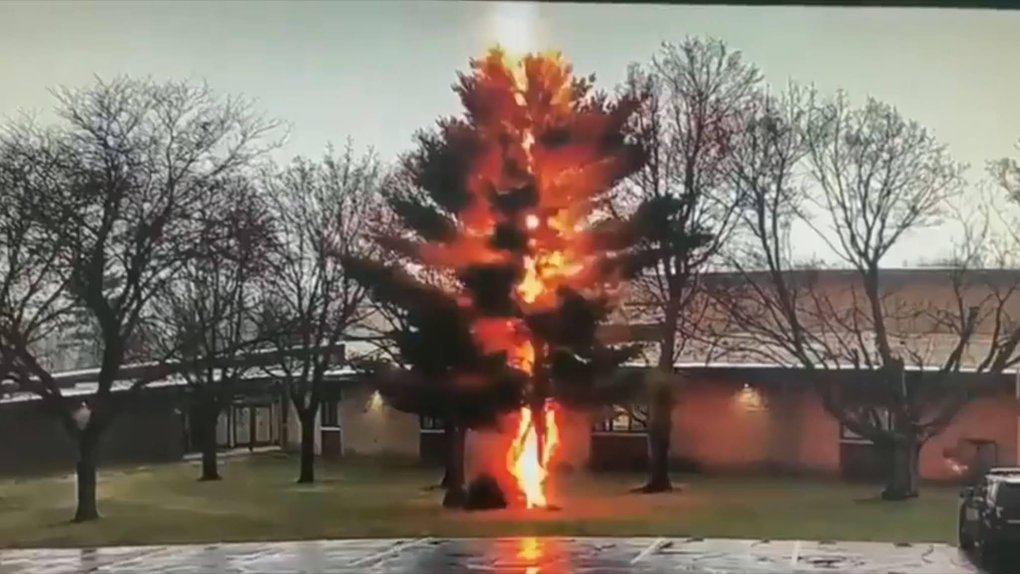 Une étonnante séquence de caméra de sécurité d'un lycée du Wisconsin montre un coup de foudre brisant un arbre de taille en quelques secondes.
